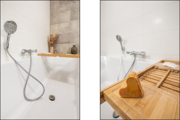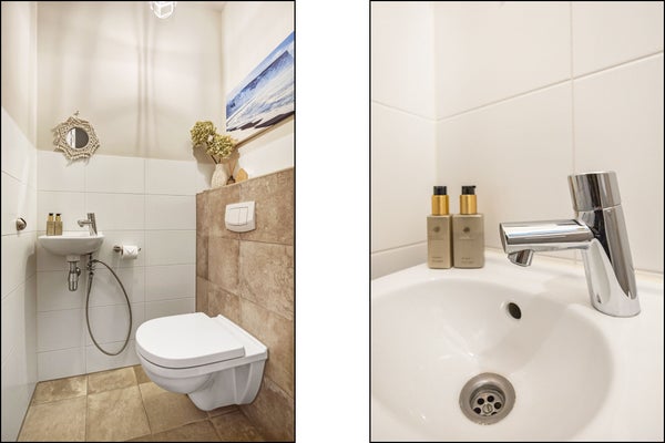 The centrally located bathroom is comfortably and stylishly finished and includes a bathtub, walk-in shower with rain and handheld shower, wide washbasin vanity unit, towel radiator, underfloor heating and modern, timeless floor-to-ceiling tiling. Adjacent to the bathroom is a separate toilet with wall-mounted closet and washbasin.