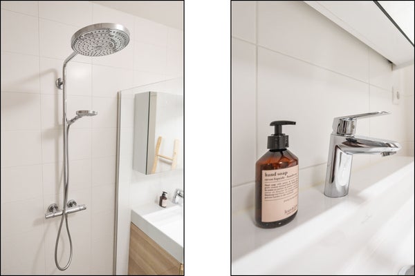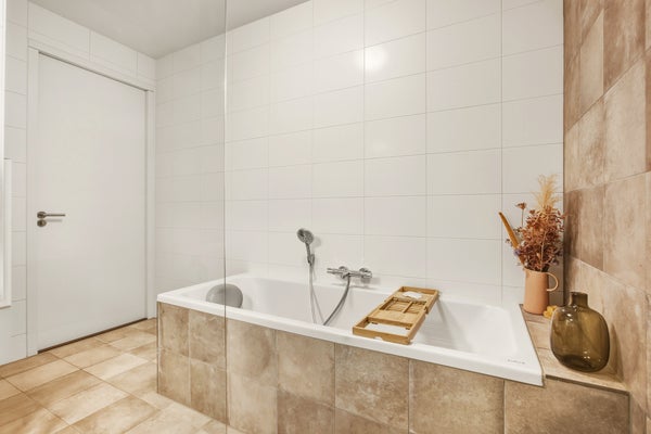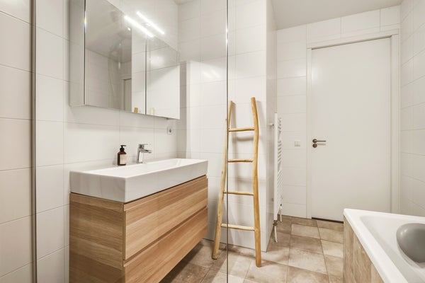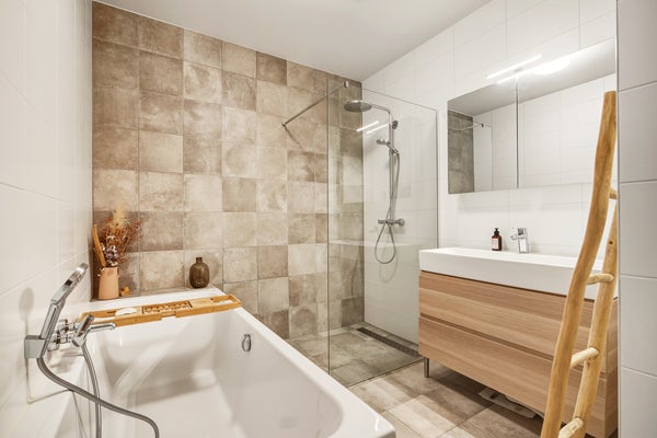 De centraal gelegen badkamer is comfortabel en stijlvol afgewerkt en beschikt over een ligbad, inloopdouche met regen- en handdouche, breed wastafelmeubel, handdoekradiator, vloerverwarming en modern en tijdloos tegelwerk tot het plafond. Naast de badkamer bevindt zich een separate toiletruimte met wandcloset en fontein.