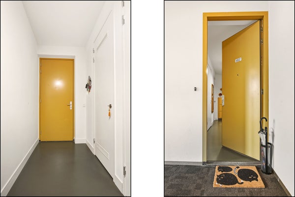 Via de verzorgde gemeenschappelijke entree met lift bereik je het appartement op de tweede verdieping. De royale hal met videofooninstallatie geeft toegang tot alle vertrekken en beschikt over praktische berging en een aparte wasruimte met aansluiting voor een wasmachine en een droger.