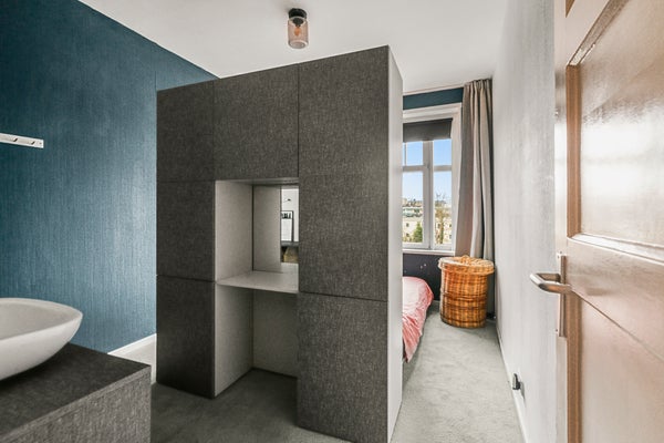 The apartment features two bedrooms. The spacious master bedroom (approx. 11 m²) includes practical built-in wardrobes. The second bedroom is currently used as a home office, fitted with custom-made cabinetry and equipped with a washing machine connection.