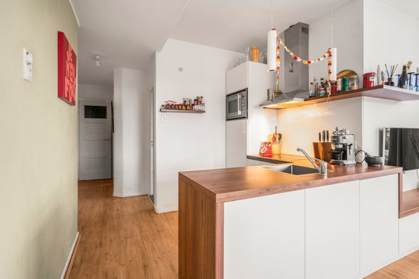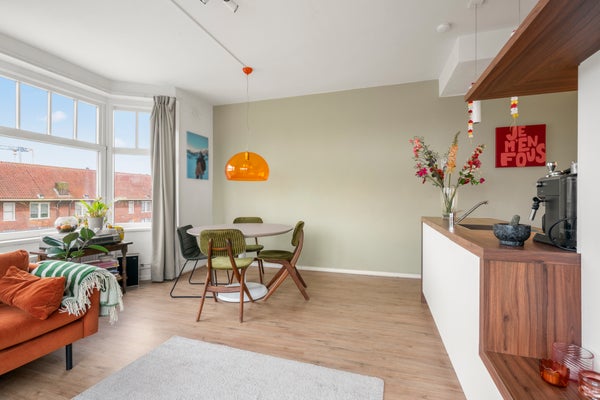 Via het gemeenschappelijke trappenhuis bereik je dit sfeervolle appartement op de derde verdieping. Bij binnenkomst valt direct de prettige lichtinval op dankzij de hoekligging en de vele ramen.