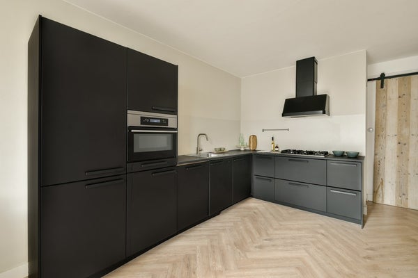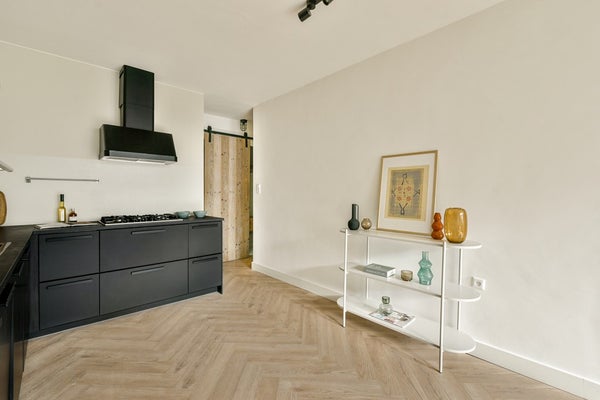 Centraal in de woning ligt de keuken, die praktisch is ingedeeld en beschikt over diverse apparatuur en voldoende bergruimte. Aangrenzend bevindt zich de badkamer, voorzien van een douche, wastafelmeubel en wasmachineaansluiting.