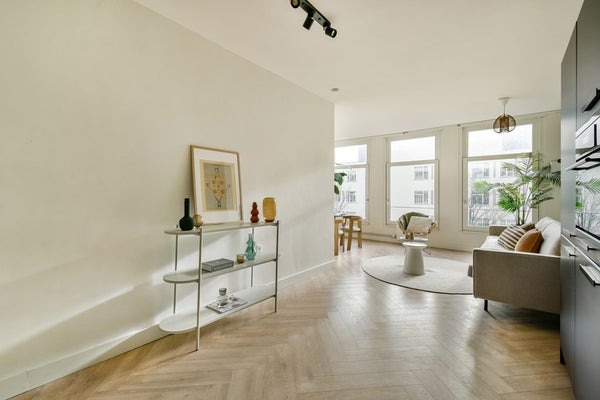 Via het gezamenlijke trappenhuis bereik je het appartement op de tweede verdieping. Je komt binnen in een ruime hal die direct toegang geeft tot vrijwel alle vertrekken. Aan de voorzijde bevindt zich de royale en lichte woonkamer, gekenmerkt door de brede raampartijen die zorgen voor veel daglicht en een levendig uitzicht over de Overtoom. Dankzij de plafondhoogte van circa 2,65 meter voelt de ruimte extra ruimtelijk aan en is er voldoende plek voor zowel een comfortabele zithoek als een eethoek.