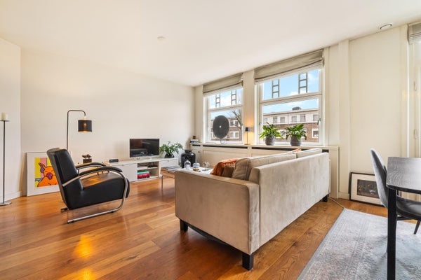 Ruime lichte woonkamer met de mogelijkheid om een tweede slaapkamer te creëren. De woning is hoogwaardig afgewerkt met een goed ingerichte keuken en een luxe badkamer en toilet.