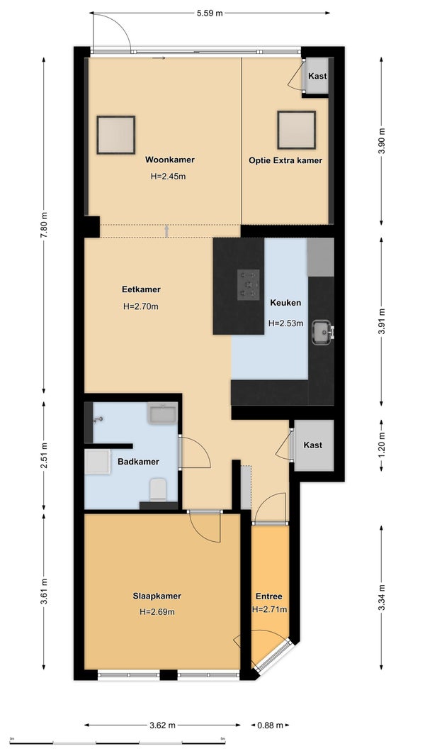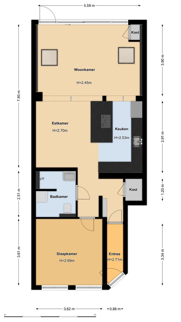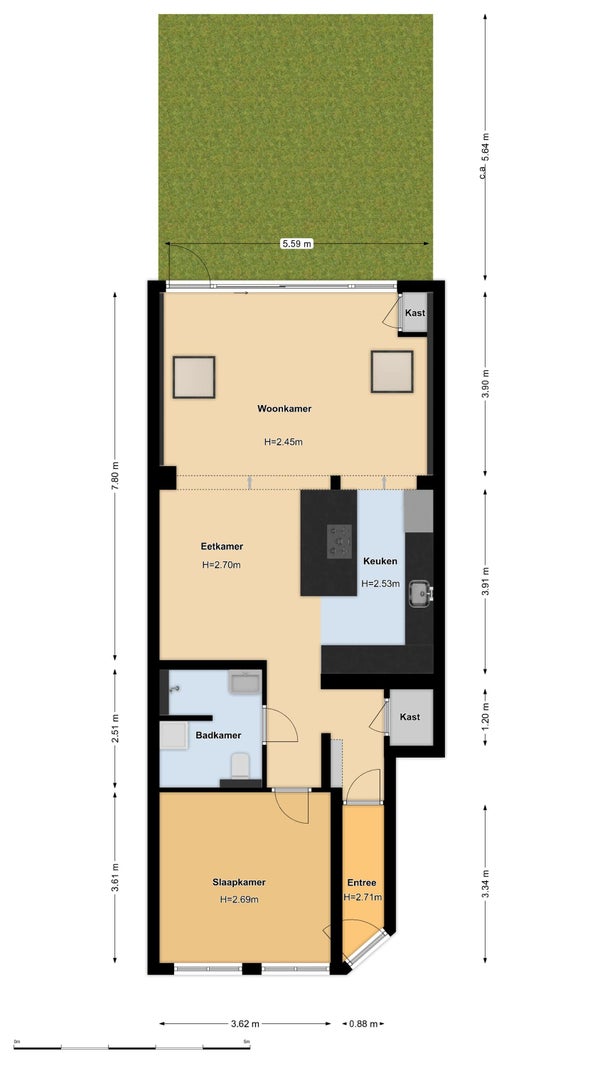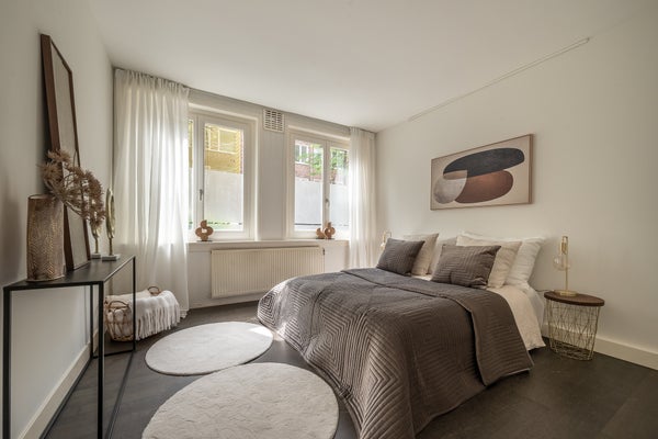 - De benedenwoning heeft een woonoppervlakte van 76 m² en beschikt over 2 kamers, waarvan 1 slaapkamer;