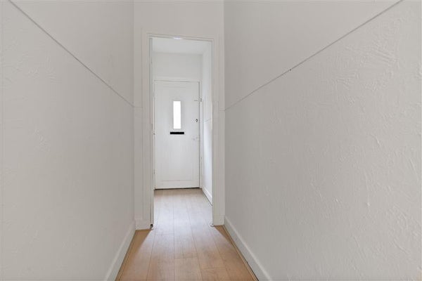 Entree, gang, hal met toegang tot de woonkamer aan de voorzijde, badkamer met douche en toilet, tweetal slaapkamers en keuken aan de achterzijde met elk een toegang tot de riante tuin.