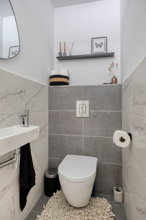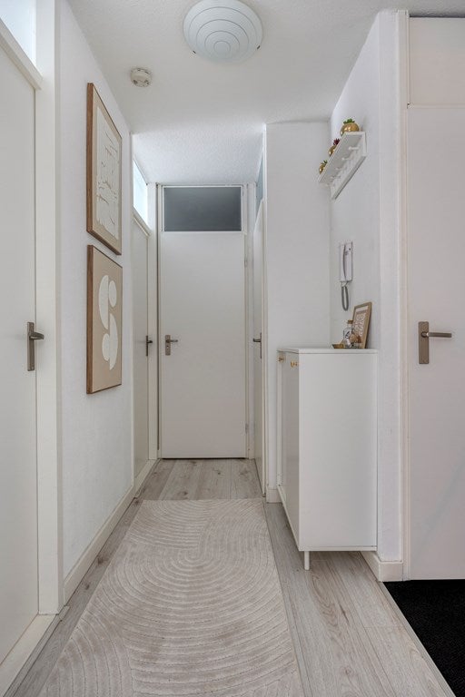 Via de eigen voordeur kom je binnen in de hal met toegang tot praktisch alle vertrekken. Aan de linkerkant bevindt zich de woonkamer met halfopen keuken. De woonkamer is bijna 30 m2. Dankzij de twee grote ramen en een glazen deur naar de tuin komt er veel zonlicht binnen. Er is voldoende ruimte voor een zithoek en een eettafel. De laminaatvloer uit de woonkamer loopt door in de keuken en de hal. Aan de keuken grenst een berging met de aansluiting voor de wasmachine en droger. Daarachter is een afgesloten ruimte waar de cv-ketel hangt. De twee slaapkamers zijn voorzien van een grijze laminaatvloer. De badkamer is ruim en goed ingedeeld met een regendouche, wastafel en een handdoekradiator.