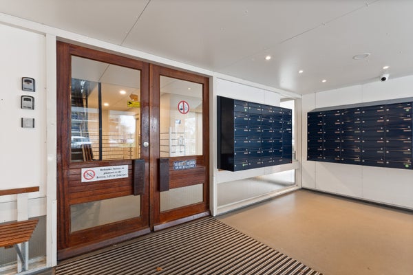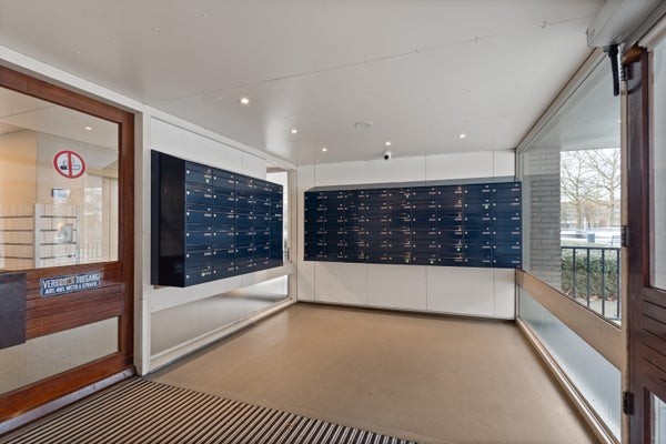 Centrale entree met brievenbussen, bellentableau, lift en trappenhuis geeft toegang tot de appartementen en de bergingen.
