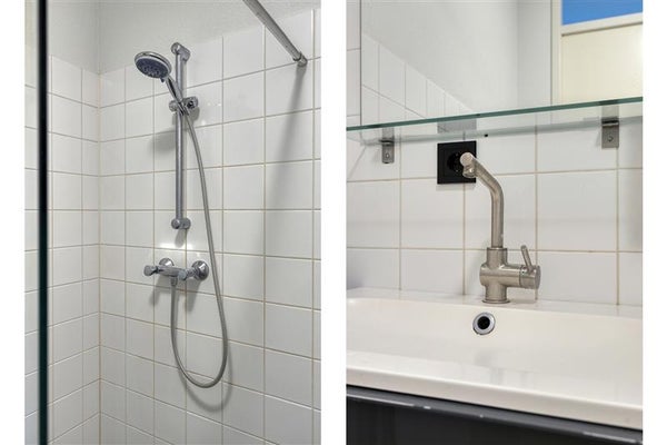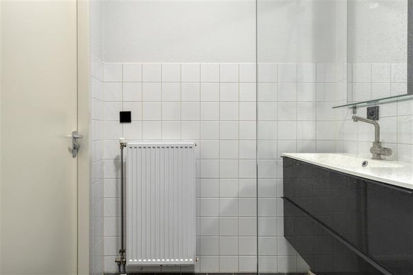 De badkamer is volledig betegeld en voorzien van een douche en wastafel, klaar voor direct gebruik. Het appartement beschikt ook over een aparte toiletruimte, bereikbaar via de hal, modern uitgevoerd en netjes afgewerkt.