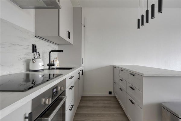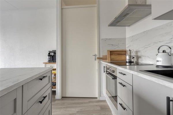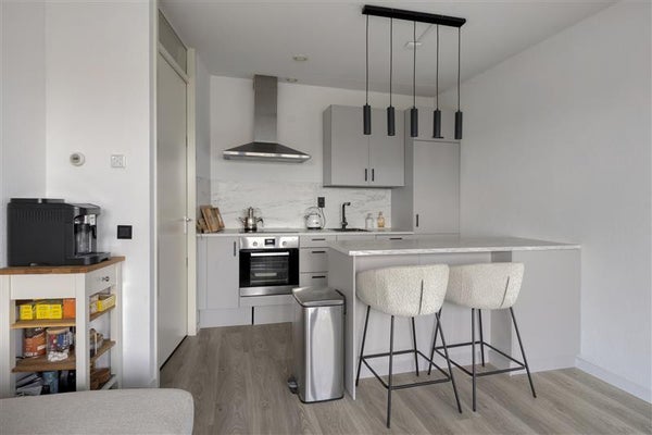 De moderne open keuken met kookeiland is een echte blikvanger: strak, compleet en direct te gebruiken. Aan het eiland kunnen twee barkrukken worden geplaatst, ideaal voor een gezellig ontbijt, diner of borrel. Dankzij de handige indeling beschik je over volop werk- en opbergruimte.