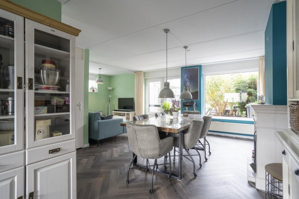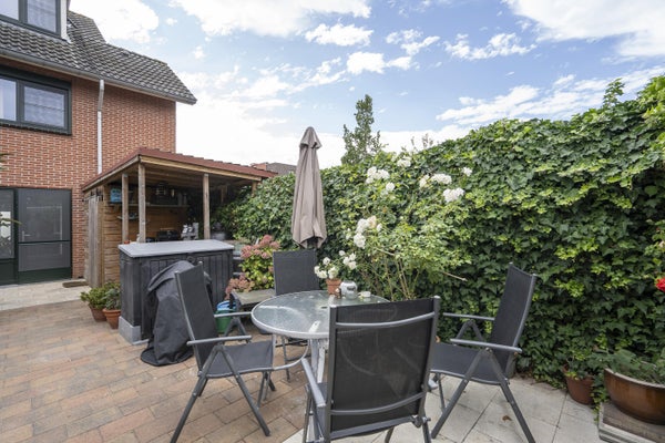 Bij binnenkomst vindt u een ruime hal met toiletruimte en toegang tot de woonkamer, die veel lichtinval heeft. De keuken is uitgerust met een M-System fornuis en voldoende kastruimte. De achtertuin is voorzien van twee bergingen en is omgeven door groen.