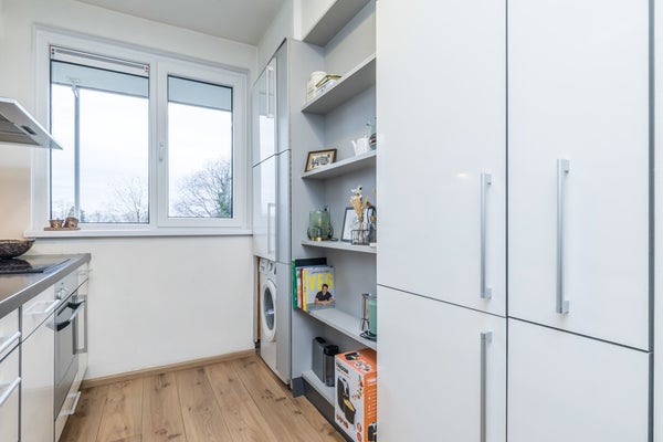 De hiernaast gelegen gesloten keuken met moderne aanbouwkeuken, voorzien van een keramische kookplaat, afzuigkap, oven, inbouwvaatwasser van het merk Bosch uit 2023, koelkast, apothekerskast en wasmachine aansluiting.