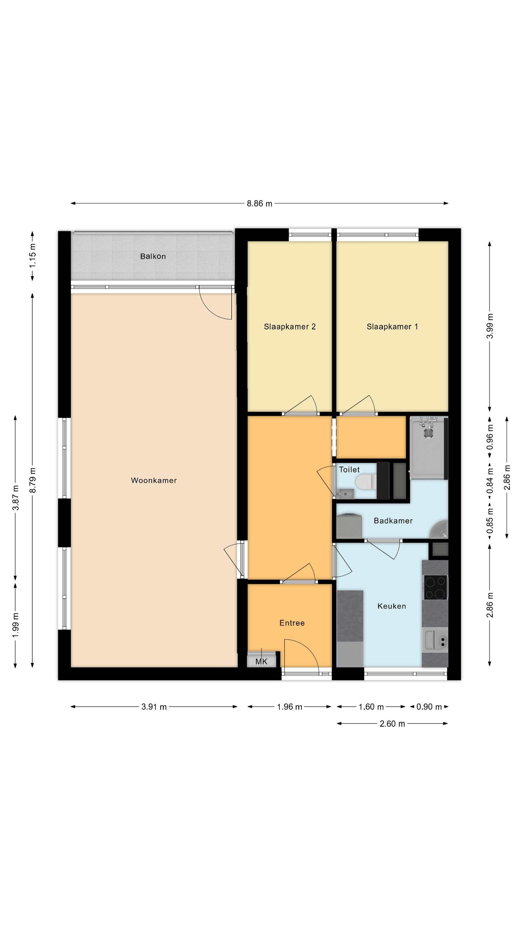 - De galerijflat heeft een woonoppervlakte van 84 m² en beschikt over 3 kamers, waarvan 2 slaapkamers;