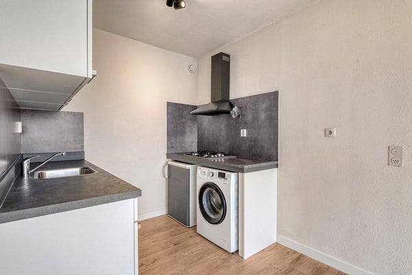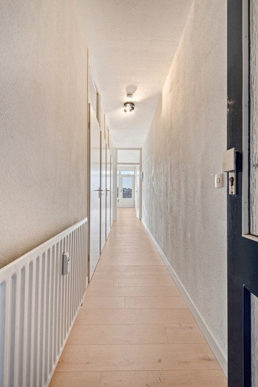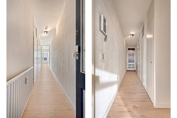 De lift brengt je naar de vierde verdieping en bijna voor de ingang van het appartement. De entree is afgewerkt met een laminaat vloer (2025), gesauste wanden en een spuitwerk plafond. De hal biedt toegang tot de living met open keuken, provisieruimte, slaapkamer en badkamer.