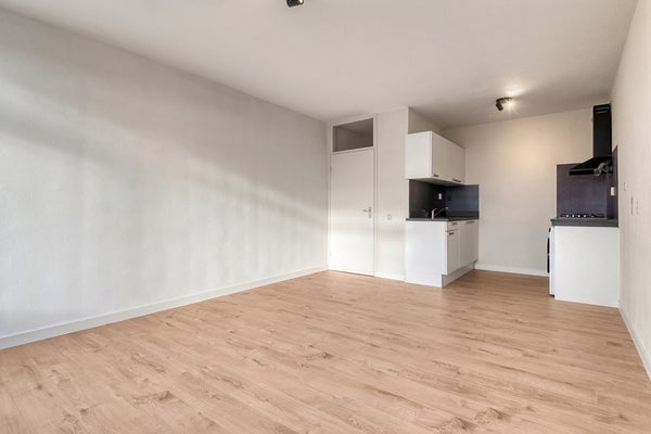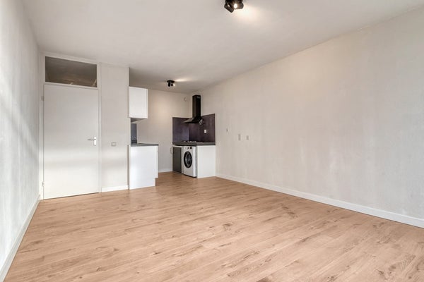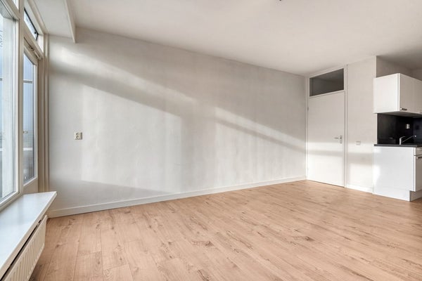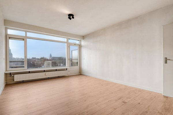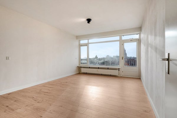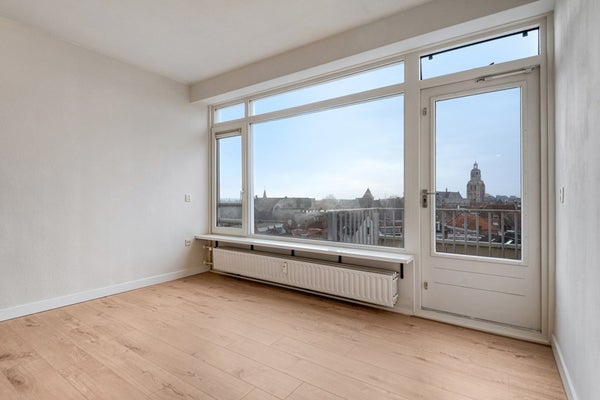 De living bestaat uit een lichte woonkamer en een open keuken. Vanuit de woonkamer geniet je van een uniek uitzicht over Bergen op Zoom (en natuurlijk de Peperbus). De woonkamer is afgewerkt met een laminaat vloer (2025), gesauste wanden en een spuitwerk plafond. De woonkamer biedt toegang tot het balkon.