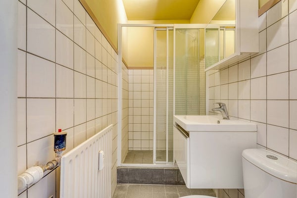 De badkamer is afgewerkt met een betegelde vloer, deels betegeld en deels gesauste wanden en een gesaust plafond. De badkamer is voorzien van een douche, wastafelmeubel, toilet en mechanische ventilatie.