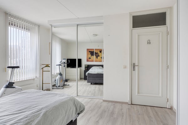 De badkamer is in 2020 vernieuwd en is geheel betegeld met inloopdouche, wastafelmeubel en met witgoedaansluitingen. De berging/bijkeuken biedt extra opbergruimten alsmede bevindt zich de cv-opstelling en mv-unit hier. Separate toiletruimte met fontein. Het royale appartement beschikt over twee slaapkamers met een grootte van 7,7m2 en 17,6m2.