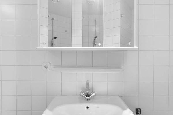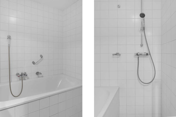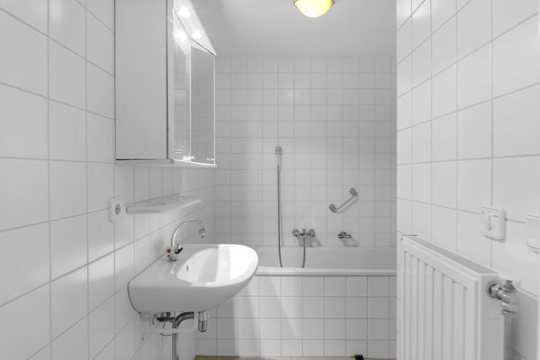 Het toilet en de badkamer zijn beiden toe aan een moderniseringsslag. De badkamer is nu volledig wit betegeld en uitgerust met een doucheruimte en een wastafel.