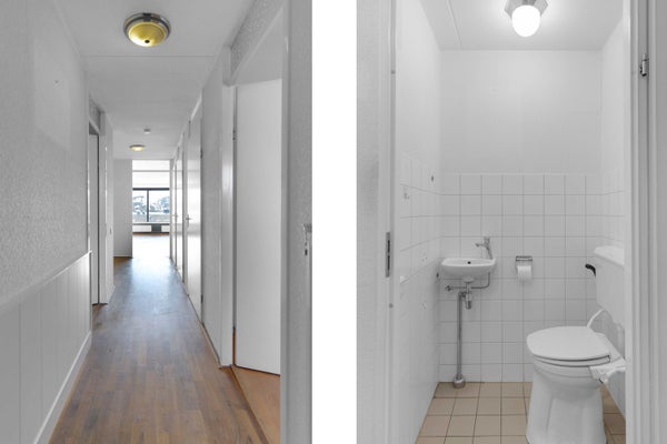 Via de trap of lift is ten midden van de galerij de woning gelegen. Bij binnenkomst stap je direct de hal binnen met toegang tot alle ruimtes. Aan de galerijzijde zijn aan beiden kanten de slaapkamers van 8 en 13 m3 gesitueerd met vaste kastruimte.