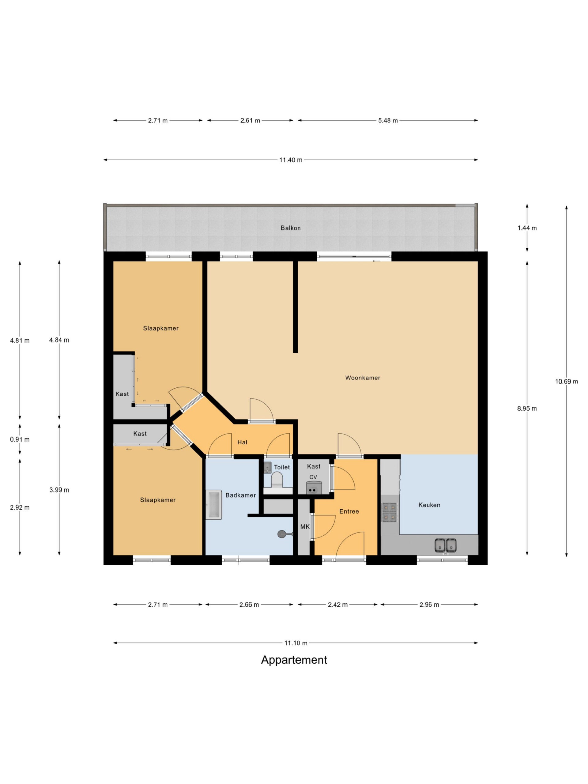 - De galerijflat heeft een woonoppervlakte van 99 m² en beschikt over 3 kamers, waarvan 2 slaapkamers;