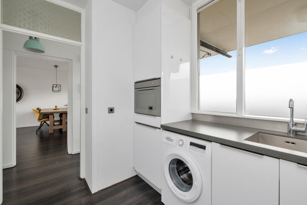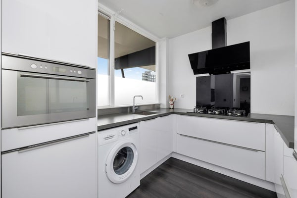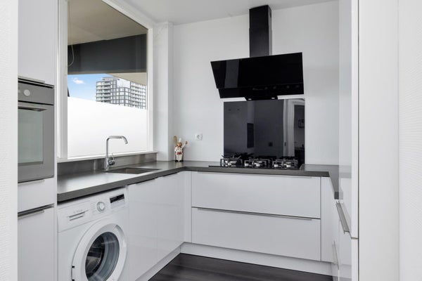 Via de afgesloten centrale entree bereikt u met de lift de vijfde verdieping. De entree van het appartement geeft toegang tot de hal met meterkast, telecominstallatie en een garderobekast. Aan de linkerzijde bevindt zich de keuken in hoekopstelling, uitgevoerd in hoogglans wit. De cv ketel is netjes weggewerkt in een hoge kast. De keuken is voorzien van een inbouwvaatwasser, wasmachine onder het werkblad, een gasfornuis met vier pitten en wokbrander, oven en een koel vriescombinatie.