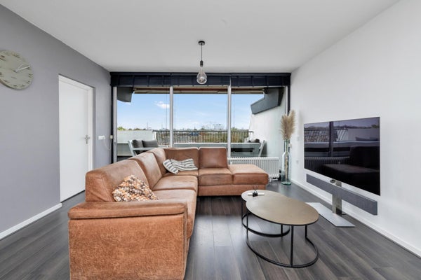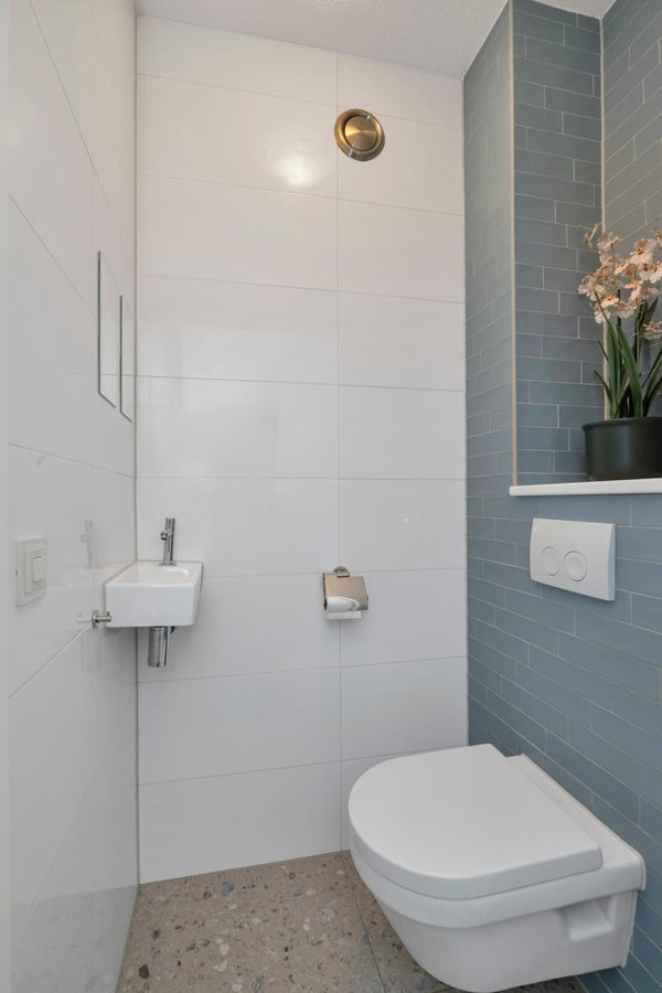 In de hal bevindt zich tevens het toilet met zwevend closet en fonteintje. De woonkamer is opvallend licht dankzij de grote raampartijen en de schuifpui naar het terras. De donkere laminaatvloer en het strakke vliesbehang zorgen voor een rustige en verzorgde uitstraling.