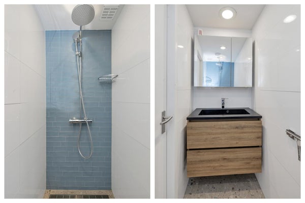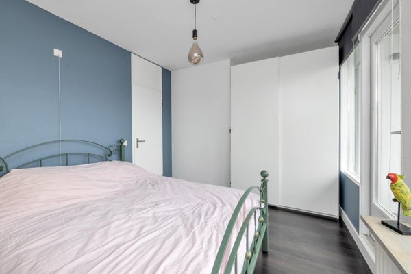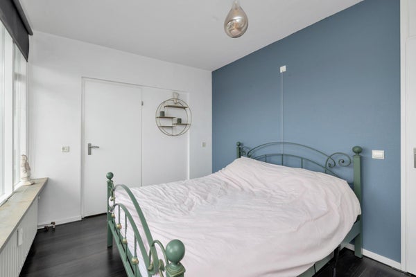 Grenzend aan de woonkamer ligt de slaapkamer, met directe toegang tot de badkamer. De badkamer is praktisch ingericht met een douche, wastafelmeubel, spiegelkast en mechanische ventilatie.
