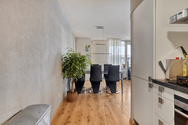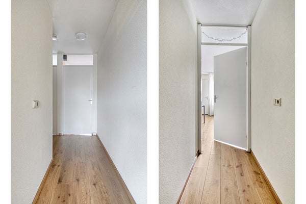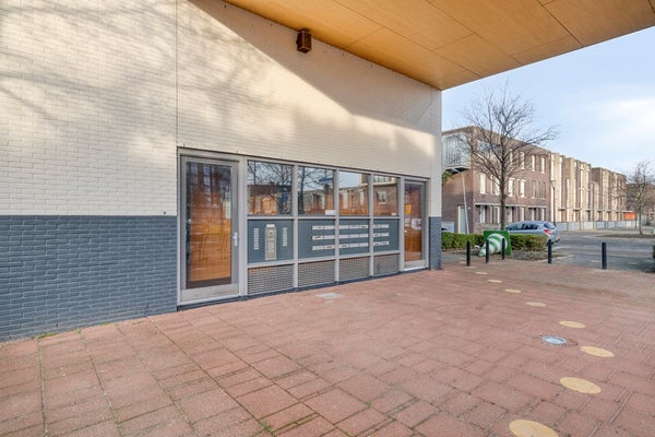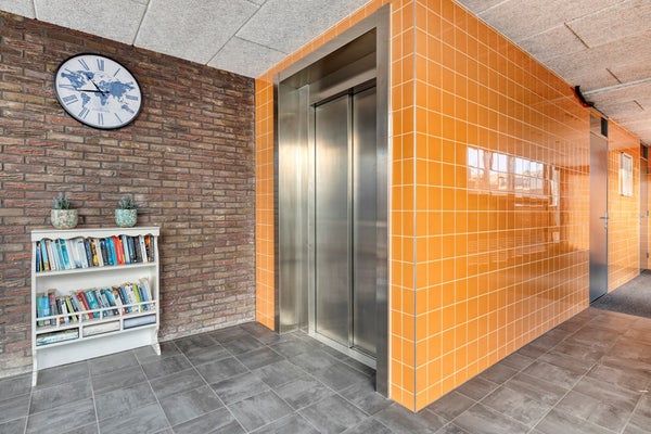 U betreedt het complex aan de straatzijde via de gezamenlijke entree, waar u de brievenbussen en intercoms aantreft. Vanaf hier kiest u voor de trap of de lift naar de verdieping waar het appartement is gelegen. Via de galerij bereikt u de voordeur van de woning. Eenmaal binnen komt u in de entreehal, waar voldoende ruimte is voor een kapstok of opbergmeubel. Deze hal vormt een prettige binnenkomst en leidt u op natuurlijke wijze verder naar de woonkamer, waardoor u direct een gevoel van ruimte en licht ervaart.