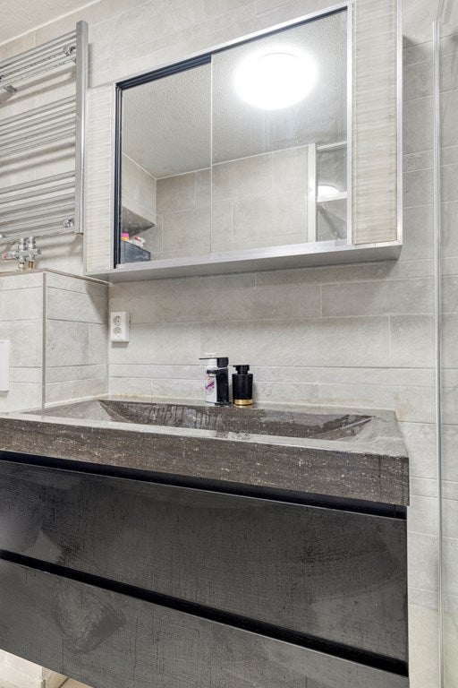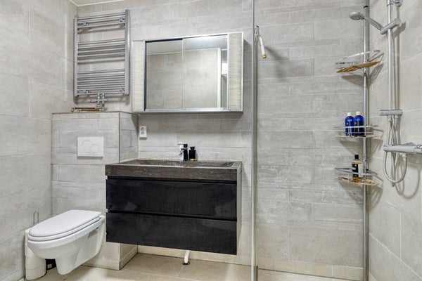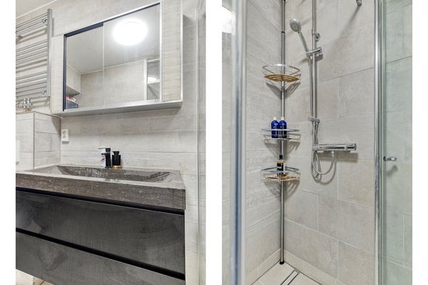 De badkamer grenst aan de hal en is volledig betegeld in een moderne stijl. U beschikt hier over een nette douchecabine, een wastafel met spiegel, een handdoekradiator en een zwevend toilet. Alles is verzorgd en instapklaar, zodat u hier zonder aanpassingen direct gebruik van kunt maken.