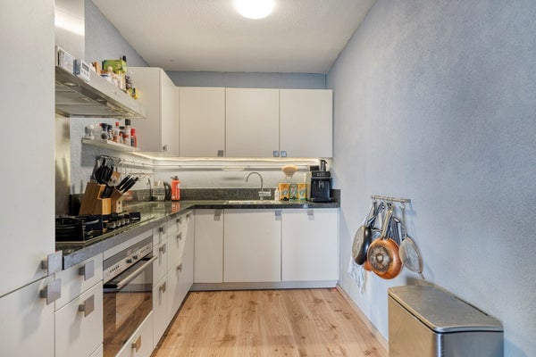 De moderne open keuken sluit naadloos aan op de woonkamer en is uitgevoerd met een L-vormig aanrechtblad. Hier kookt u met gemak dankzij de complete inbouwapparatuur, waaronder een gasfornuis met afzuigkap, vaatwasmachine, ovencombinatie, spoelbak en koelkast. De keuken biedt volop opbergruimte in lades en kasten, waardoor alles overzichtelijk en binnen handbereik blijft. De strakke afwerking en praktische indeling maken dit een keuken waar u met plezier tijd doorbrengt.