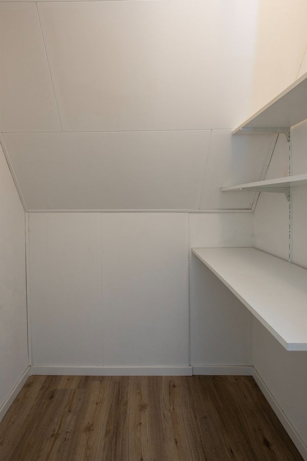 Achter de badkamer ligt een praktische bijkeuken met extra bergruimte, aansluiting voor wasapparatuur en de opstelling van de cv-ketel, boiler en verdeler voor de vloerverwarming. Vanuit hier bereik je de achtergelegen berging met eigen achteringang.
