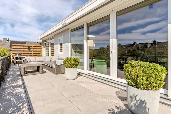 - Dakterras op het zuiden circa 40 m2 en balkon op het noorden circa 15 m2