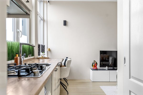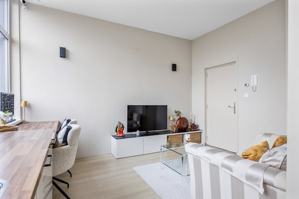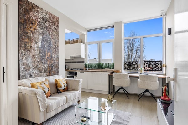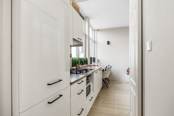 Ruime woonkamer met veel lichtinval en vrij uitzicht over de stadsgracht. De open keuken is op een praktische manier tussen de woonkamer en de slaapkamer in geplaatst. In het verlengde van het aanrecht is een extra blad bevestigd, waarmee een eettafel is gecreëerd. De keuken beschikt over een modern keukenblok met inbouwapparatuur. De deur naar de badkamer bevindt zich tegenover de keuken. De badkamer is in 2024 geheel vernieuwd en voorzien van een douche, wastafel, toilet en wasmachine-/wasdrogeraansluiting.