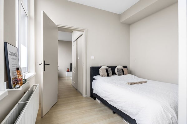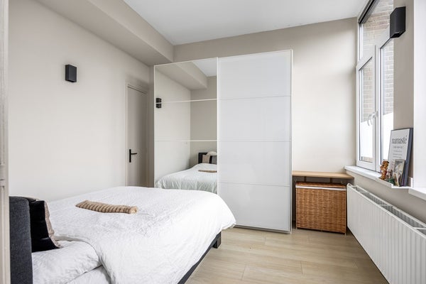 De ruime, bijna vierkante slaapkamer is bereikbaar vanuit de keuken. In de slaapkamer bevindt zich een vaste kast. De 2 grote ramen aan de voorzijde zorgen voor veel lichtinval.