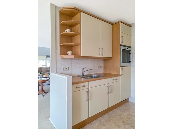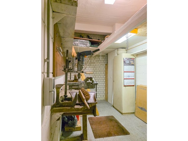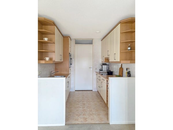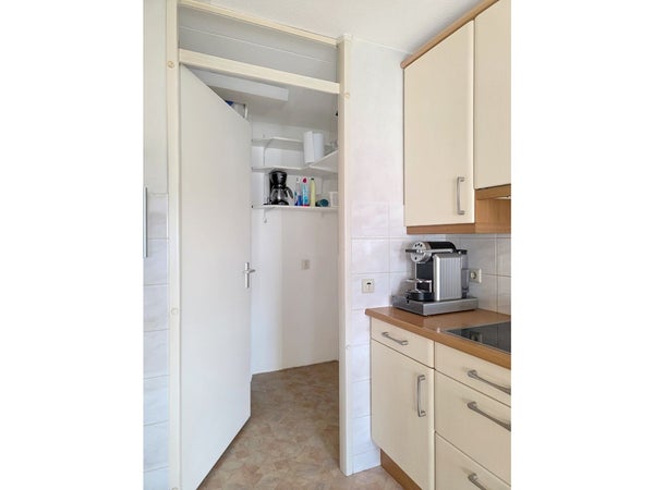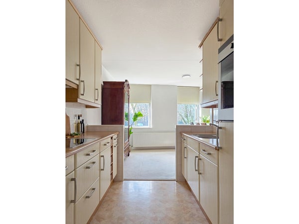 De keuken is functioneel ingericht en beschikt over voldoende kastruimte. Aansluitend bevindt zich de praktische bijkeuken met de Cv-opstelling, wasmachine-aansluiting en extra bergruimte, ideaal voor het opbergen van huishoudelijke zaken.