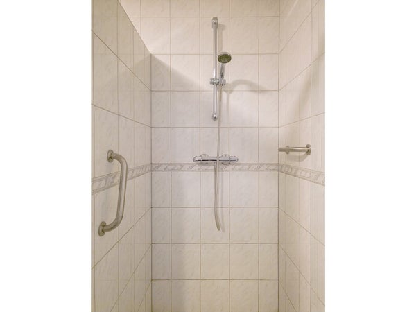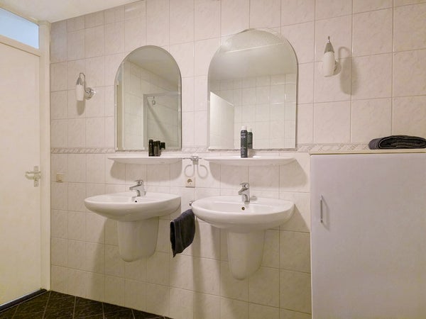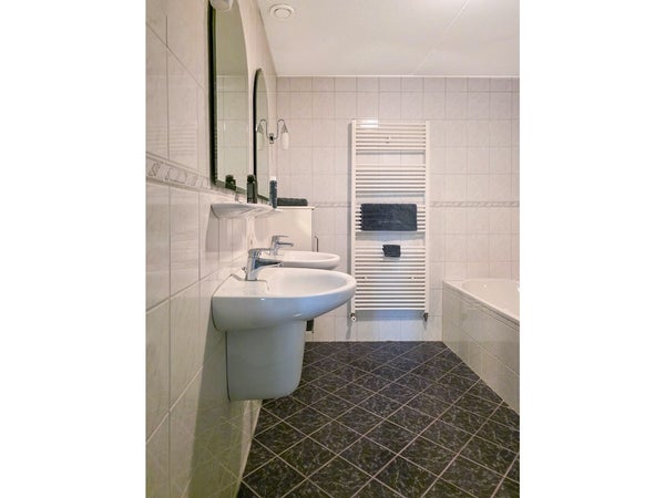 De complete badkamer is voorzien van een ligbad, een aparte douche en twee wastafels wat zorgt voor extra gebruiksgemak.