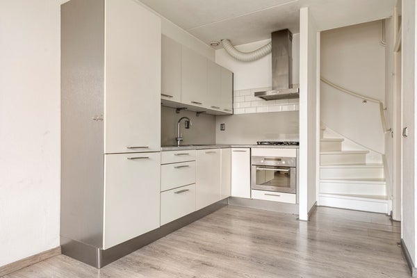 EERSTE VERDIEPING: Hal/entree met garderobehoek en toilet met fontein. De gehele eerste verdieping is voorzien van een moderne, bruinkleurige laminaatvloer en pleisterwerk wanden. Ruime woonkamer met toegang tot het zonnige balkon. De woonkamer staat in open verbinding met de keuken, deze is voorzien van een moderne complete keukeninrichting in hoekopstelling met o.a. 4- pits gaskookplaat, RvS afzuigkap, koel/vrieskast en oven. Vanuit de keuken is er toegang tot de trapopgang naar de tweede verdieping.