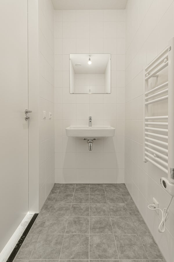 In het privé gedeelte: hal met entree; technische ruimte met groepenkast (6 groepen, 2 fase groep, 3 fase groep en 3 aardlekschakelaars), aansluitmogelijkheid voor glasvezel van Ziggo of KPN (door koper zelf te regelen), plaats van de warmtepomp, boiler en ventilatie unit (losse handzender), aansluitingen voor de wasapparatuur, verdeler van de vloerverwarming; toiletruimte met licht grijze vloertegels en witte wandtegels, wandcloset (softclose) en fonteintje; woonkamer met dubbele deuren bij een Frans balkon; open keuken met een frisse witte inrichting voorzien vaneen zwart aanrechtblad, diverse kastjes, besteklade en inbouwapparatuur te weten een inductiekookplaat, recirculerende afzuigkap, koelkast met vriesvak, combinatie magnetron/oven en vaatwasmachine (klein model); slaapkamer met ramen voorzien van draai-/kiepsysteem en geluiddempend aluminium inbouw muurrooster; volledig betegelde badkamer met licht grijze vloertegel en witte wandtegels, douchevloer met thermostaatkraan, wastafelmeubel en elektrische radiator.