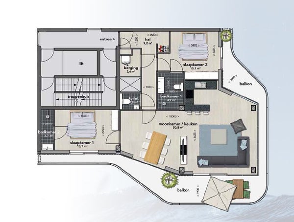 - De galerijflat heeft een woonoppervlakte van 102 m² en beschikt over 3 kamers, waarvan 2 slaapkamers;