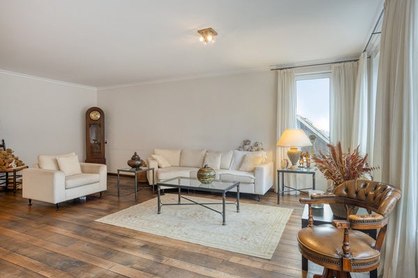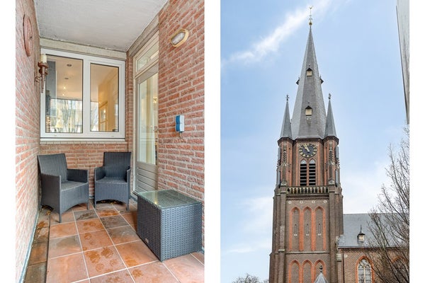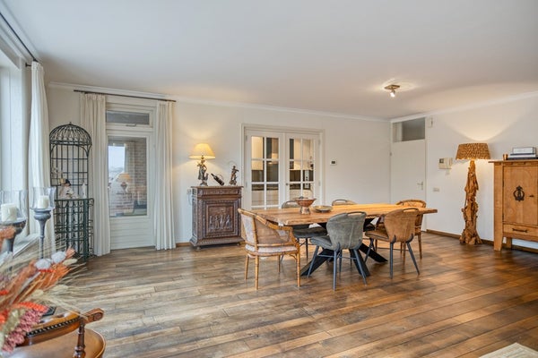 Een zeer ruim opgezette woonkamer, ca. 50 m², met een massief eiken vloer, granol wanden en een stucwerk plafond. Hier bevindt zich ook een video-intercom. Er is veel daglicht aanwezig middels diverse kunststof raamkozijnen (draai-/kiep) met dubbele beglazing. Via een hardhouten terrasdeur met dubbele beglazing toegang tot het deels overdekte balkon, met een tegelvloer. Vanuit de woonkamer en het balkon een mooi zicht op de pastorie en de grote kerk.