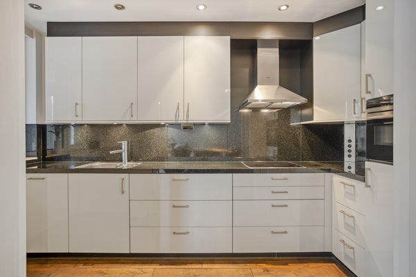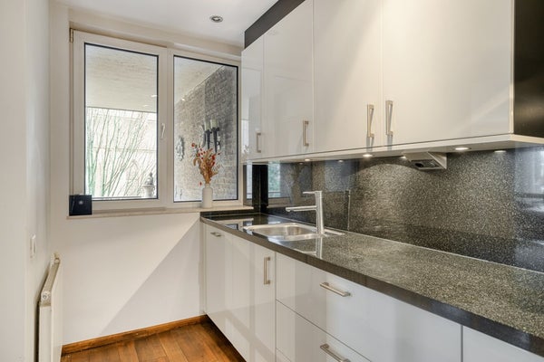 Via openslaande deuren met glas-in-roeden naar de keuken. Keuken met een massief eiken vloer, stucwerk wanden en -plafond met diverse inbouwspots. De luxe keukeninrichting is voorzien van een granieten aanrechtblad en -achterwand, een RVS spoelbak met restbakje, een vaatwasser, een inductiekookplaat, een RVS schouw afzuigkap, een koelkast en een combimagnetron. Veel bergruimte aanwezig in diverse laden en kasten. Via een kunststof raamkozijn (draai-/kiep) met dubbele beglazing zicht op het balkon.