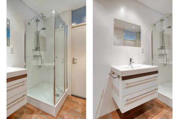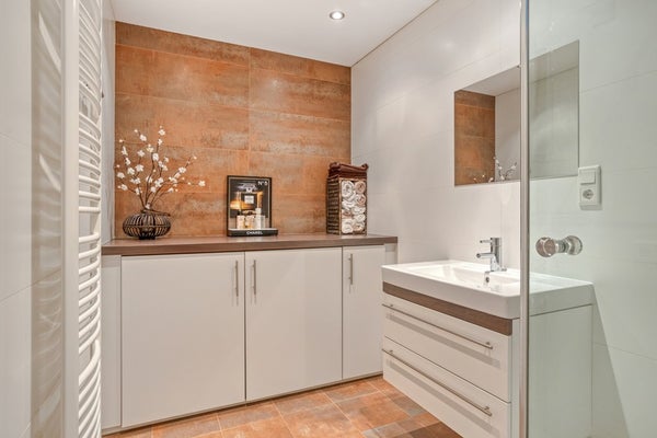 De moderne, volledig betegelde badkamer heeft een stucwerk plafond met inbouwspots en is voorzien van een badmeubel met vaste wastafel en een spiegel en een douchecabine met glazen deuren en een thermostaatkraan. Hier bevindt zich ook een praktisch meubel met werkblad en de aansluitingen voor de wasapparatuur.