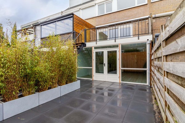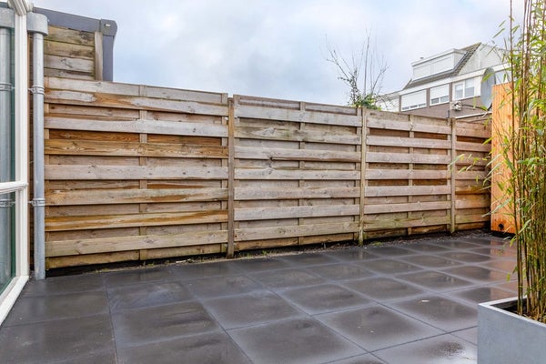 De onderhoudsvriendelijke tuin is volledig bestraat en biedt volop ruimte om heerlijk buiten te zitten. Achterin de tuin bevindt zich een praktische berging, ideaal voor extra opslag. De tuin is omsloten door houten schuttingen en voorzien van plantenbakken met bamboe, die zorgen voor een groene uitstraling en extra privacy ten opzichte van het pad van de bovenburen.
