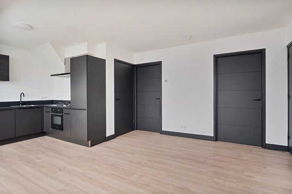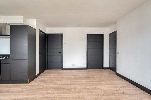 Aan de achterzijde bevindt zich de ruime en lichte woonkamer, met een prettige plafondhoogte en voldoende ruimte voor een comfortabele zit- en eethoek. De woonkamer vormt het centrale leefgedeelte van het appartement.
