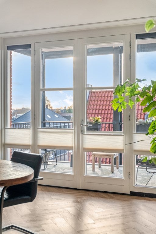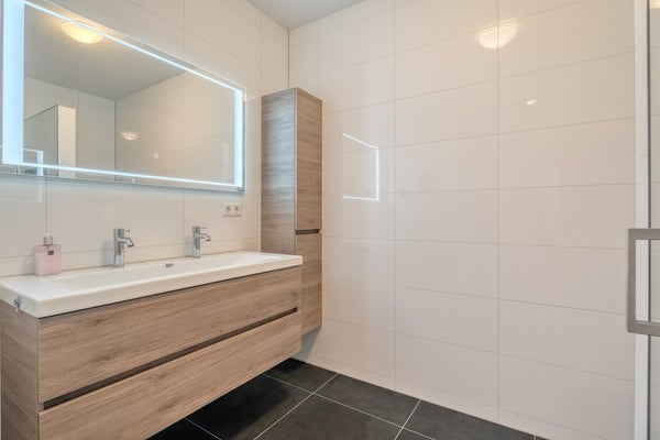 Binnen is de indeling logisch en prettig. De woonruimte loopt over de volledige lengte van het appartement en wordt op natuurlijke wijze verbonden door het kookeiland in het midden. Aan de ene zijde de woonkamer, ruim en ontspannen, aan de andere zijde de eetruimte waar lange diners vanzelf ontstaan. Alles klopt hier. De hoogwaardige afwerking met een PVC visgraatvloer door de hele woning en strak afgewerkte plafonds geeft het appartement een rustige, luxe uitstraling.