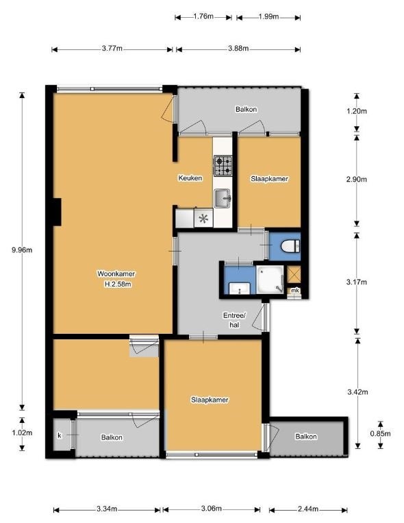- De galerijflat heeft een woonoppervlakte van 69 m² en beschikt over 4 kamers, waarvan 3 slaapkamers;