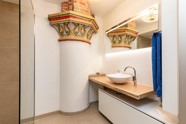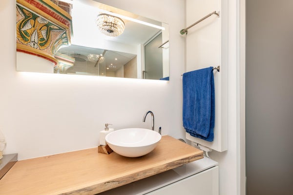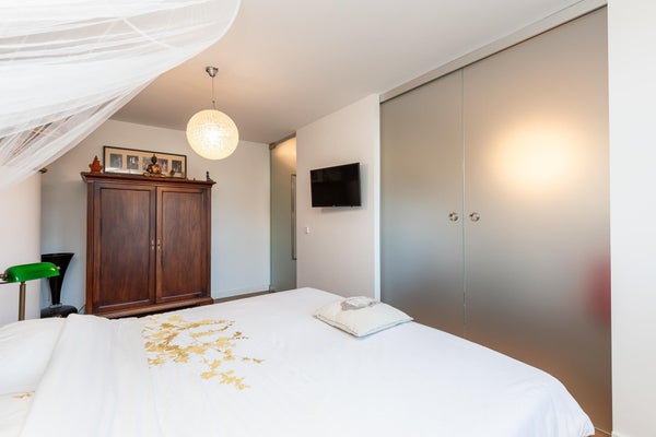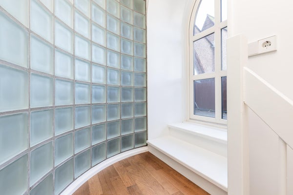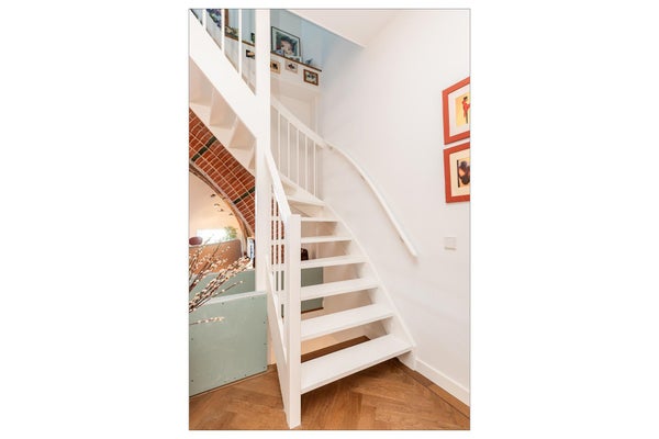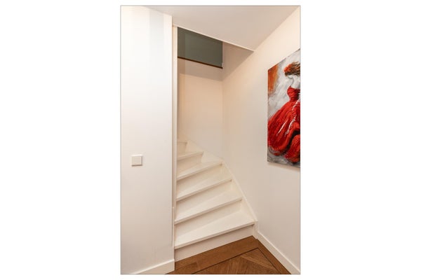 De woonkamer, bereikbaar via de trap, is een echte eyecatcher met authentieke kerkplafonds die een adembenemend effect creëren elke keer dat je thuiskomt. De ruimte, met zijn Franse eikenhouten vloer en strakke witte muren, biedt een perfecte ambiance om te ontspannen of om te genieten van gezellige avonden met vrienden.