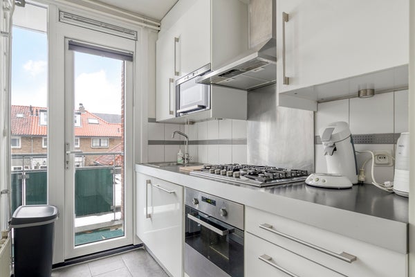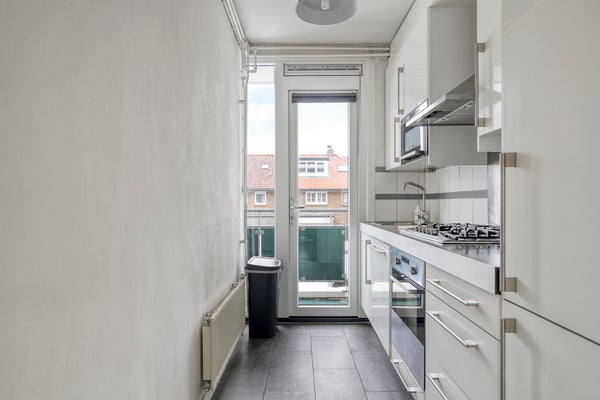 Entree, hal met meterkast, toiletruimte met zwevend toilet. De lichte en royale woon-/eetkamer vormt het hart van de woning. Vanuit de gezellige eethoek is er via een deur toegang tot het zonnige balkon op het zuiden (ca. 5 m²), met vrij uitzicht over de groene woonomgeving. De keuken is praktisch ingericht en voorzien van diverse inbouwapparatuur, waaronder een 5-pits gaskookplaat, vaatwasser, oven en afzuigkap. Vanuit de keuken is er toegang tot het achtergelegen balkon.