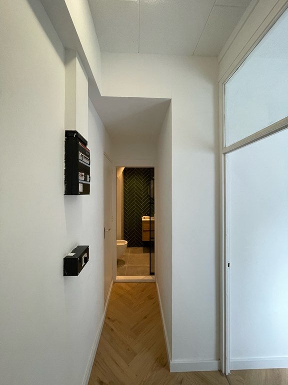 Bij binnenkomst springt de lichte woonkamer met luxe halfopen keuken voorzien van hoge plafonds en grote ramen direct in het oog. Vanuit de hal te bereiken moderne badkamer voorzien van toilet, ruime inloopdouche en wastafel inclusief wastafelmeubel.