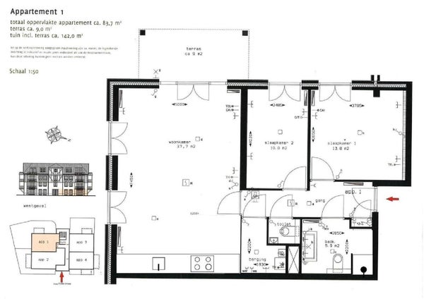 - De galerijflat heeft een woonoppervlakte van 84 m² en beschikt over 3 kamers, waarvan 2 slaapkamers;